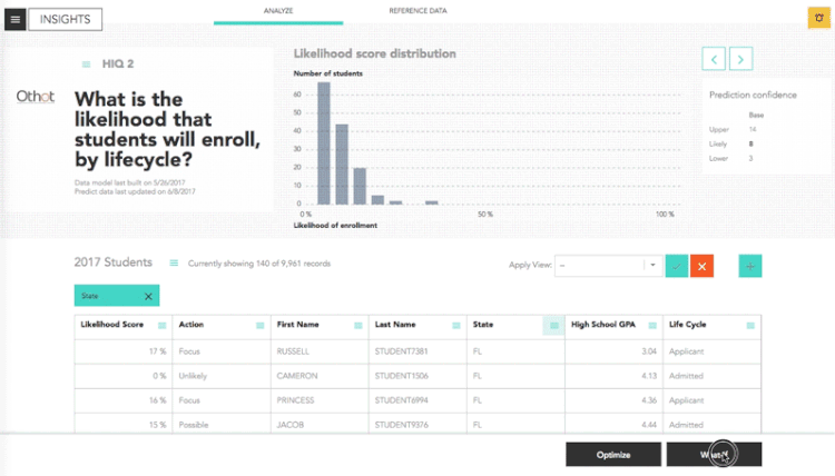 Although each vendor’s enrollment management system differs in methodology and design, like all predictive analytical tools, they aggregate data from a variety of sources and then assign outcome probabilities based on historical data models.